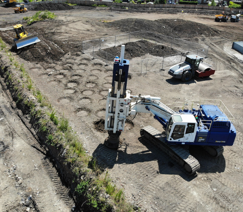 This is a highly efficient way to compact the ground. It provides an alternative to excavation and re-compaction/replacement of the existing made ground, and/or any follow-on surcharging mounds to induce settlement.